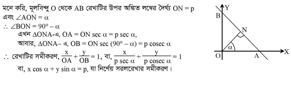 ৩.১০.৬ একটি সরলরেখার সমীকরণ নির্ণয় করো যা মূলবিন্দু থেকে এই রেখার উপর অংকিত লম্বের দৈর্ঘ্য p এবং লম্বটি x অক্ষের ধনাত্নক দিকের সাথে ∝ কোন উৎপন্ন করে: